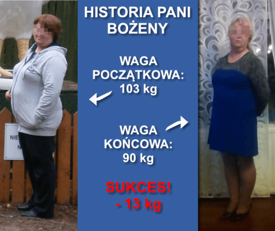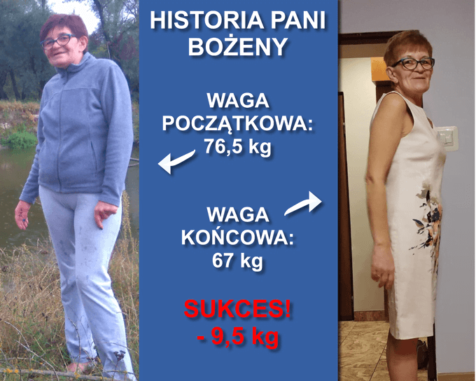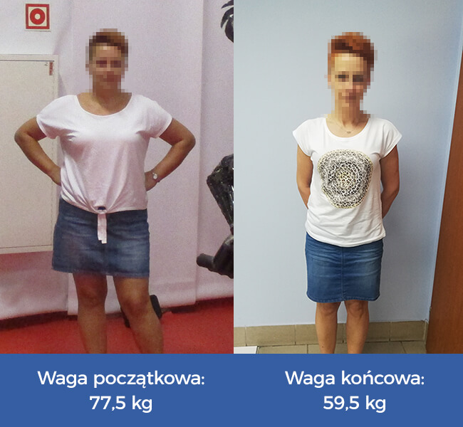 Pani Bożena przyszła do nas na początku lipca 2018 roku z wagą 103 kg. Swoją kurację zakończyła przed świętami Bożego Narodzenia z wynikiem 90 kg co nam daje wynik 13 kg w pół roku!