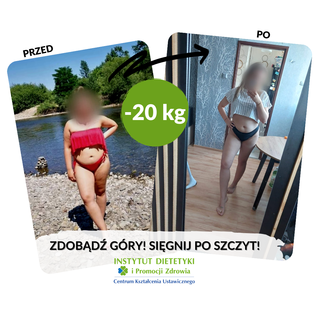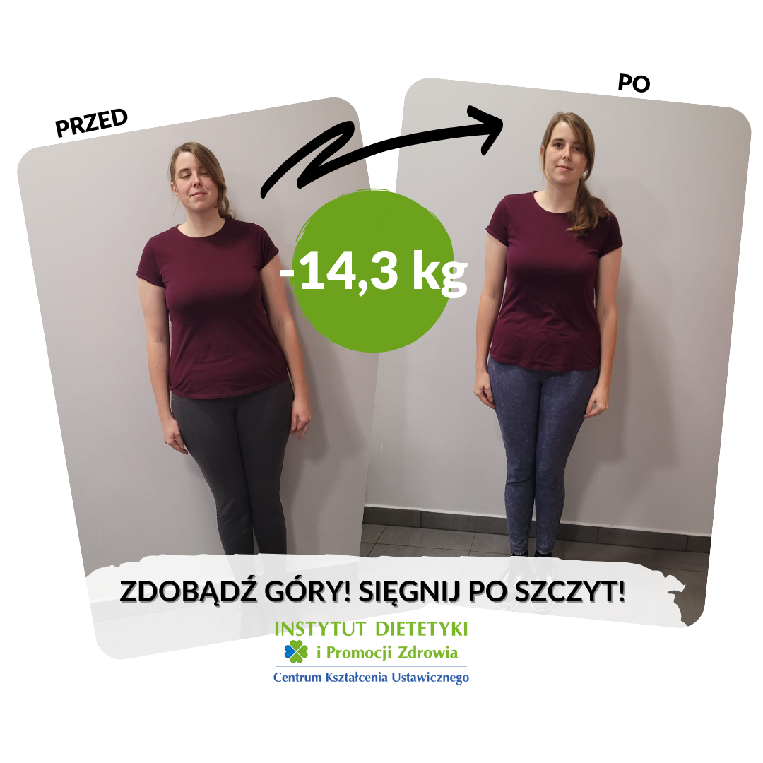 Poniżej kilka słów od Pani Agnieszki „Do Pani Katarzyny trafiłam w sierpniu 2019 roku z waga 85kg. Bardzo długo zwlekałam z podjęciem decyzji o diecie ponieważ zawsze myślałam, że dieta to tylko „sałata”, ale po rozmowie z Panią Kasią i opracowaniu dla mnie diety byłam bardzo miło zaskoczona, bo w diecie miałam wszystko to co lubię. Dzięki Pani Kasi nauczyłam się zdrowego systematycznego żywienia a co za tym idzie moja waga końcowa wynosi 63kg. pozdrawiam i gorąco polecam.”