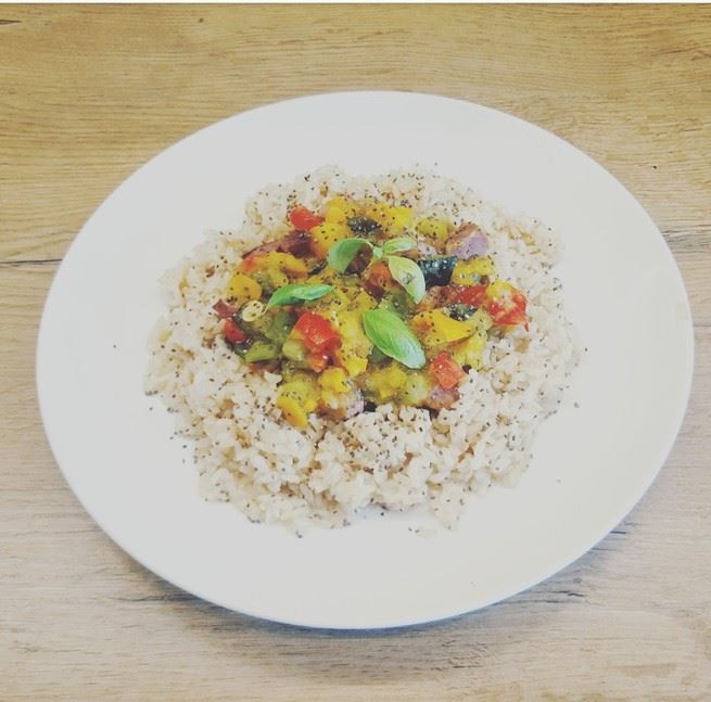 LECZO WARZYWNE Składniki na porcję: Czarnuszka - 5 g (1 x Łyżeczka)Ryż biały - 50 g (3.33 x Łyżka)Papryka czerwona - 150 g (1.07 x Sztuka)Pomidory z puszki (krojone) - 150 g (1.5 x Porcja)Cukinia - 150 g (0.5 x Sztuka)Cebula - 30 g (0.3 x Sztuka)Czosnek - 5 g (1 x...