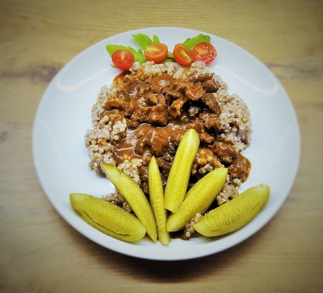 GULASZ WOŁOWY Z KASZA GRYCZANĄ Składniki na 1 porcję: Ogórki kiszone - 150 g (2.5 x Sztuka)Cebula - 50 g (0.5 x Sztuka)Pieczarki - 50 g (2.5 x Sztuka)Czosnek - 5 g (1 x Ząbek)Olej rzepakowy - 15 g (1.5 x Łyżka)Polędwica wołowa (surowa) - 100 g (1 x Porcja)Kasza...