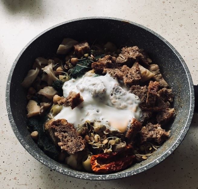 SZYBKIE DANIE Z PATELNI Składniki na 1 porcję Jajko 50 g (1 sztuka) Oliwki 25 g (10 sztuk) Boczniaki 90 g (1 garść) Pomidory suszone 21 g (3 plastry) Kiełki na patelnię 50 g (5 łyżek) Szpinak 50 g (1 porcja szpinaku w liściach) lub 1-2 garści świeżego Olej rydzowy...