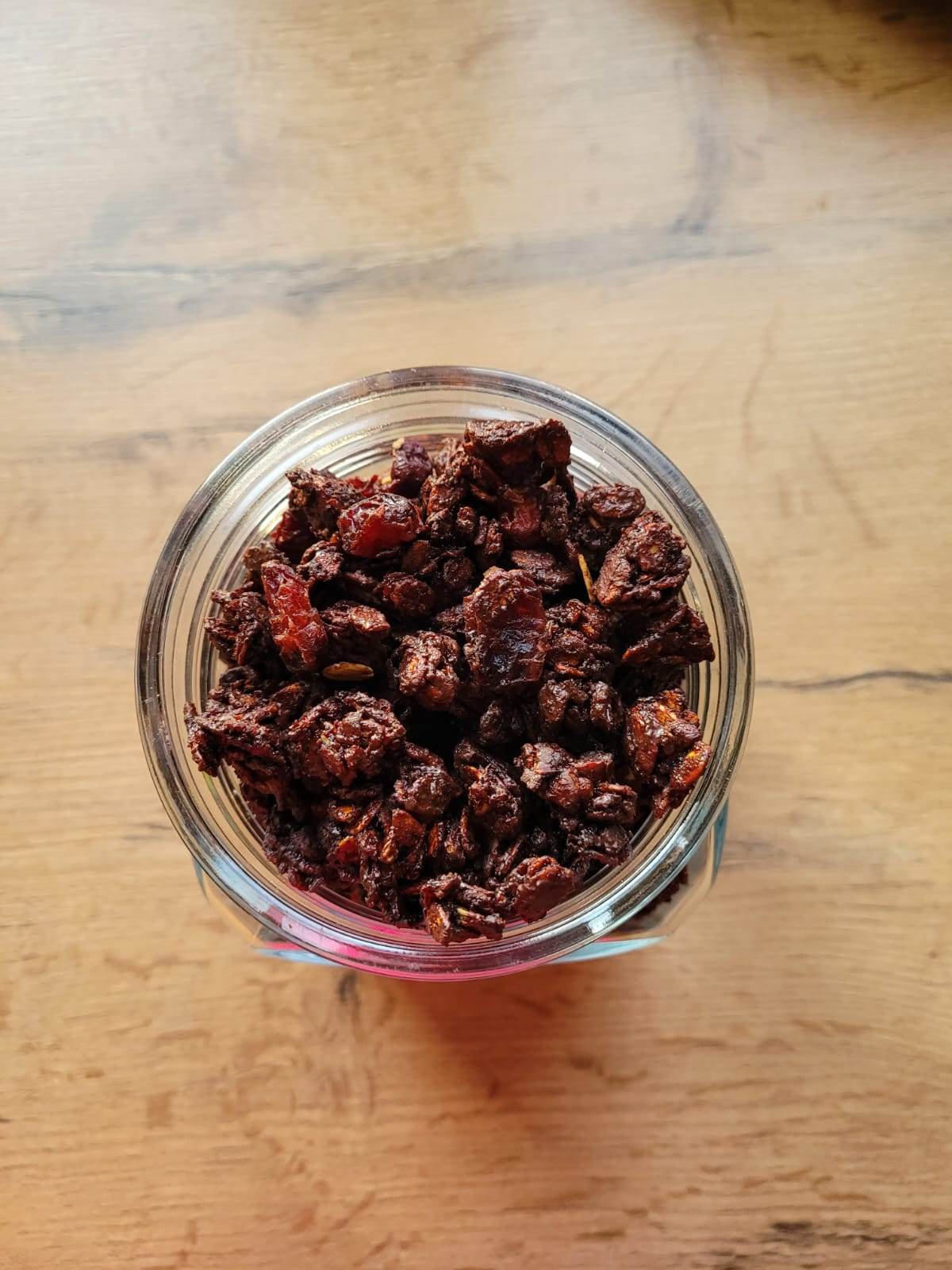 Płatki owsiane wsypujemy na blaszkę wyłożoną papierem do pieczenia. W małym rondelku mieszamy: miód, olej, kakao, przyprawę do piernika, podgrzewamy, ale nie gotujemy. Powstałą masę wylewamy na płatki owsiane, mieszamy dokładnie. Tak przygotowaną masę wkładamy do piekarnika i pieczemy w temperaturze 170 stopni, około 35 minut, co jakiś czas mieszając żeby się nie przypaliło. Do jeszcze ciepłej granoli dodajemy suszoną żurawinę i czekoladę – dokładnie mieszamy. Pozostawiamy do wystygnięcia. Przekładamy do szklanego pojemnika. Taką granolę można przechowywać 2-3 tygodnie w zamkniętym pojemniku.