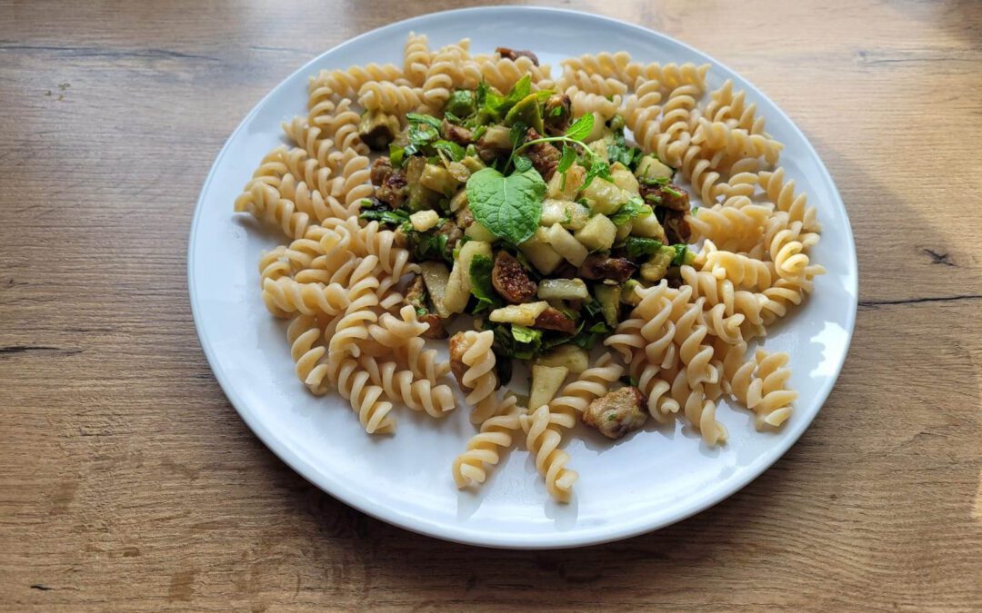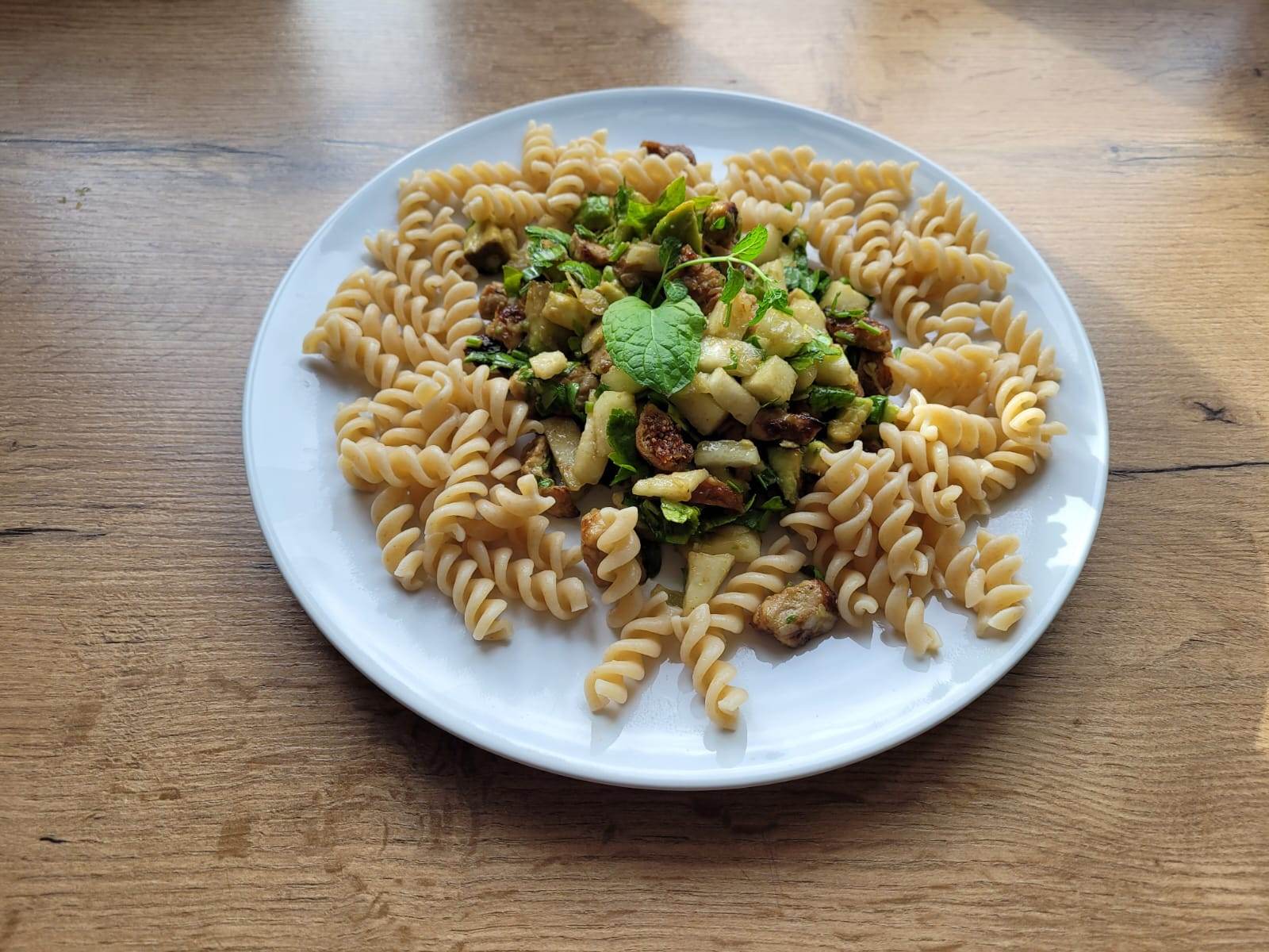 Pierś z indyka pokroić, usmażyć na oliwie z solą, pieprzem i musztardą. Makaron ugotować. Resztę składników pokroić, wszystko wymieszać doprawić solą i pieprzem polać olejem lnianym.