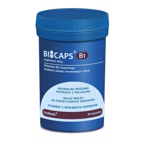 BICAPS B1 zawiera wysoką dawkę witaminy B1 – 100 mg. Czysty skład – produkt nie zawiera m.in. sztucznych wypełniaczy, przeciwzbrylaczy i barwników. Naturalna, wegańska kapsułka z pullulanu – pozyskiwanego w procesie fermentacji. Pojemnik wytworzony z użyciem roślinnych surowców. Produkt odpowiedni dla wegetarian i wegan.