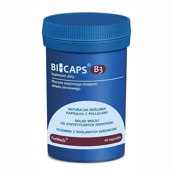BICAPS B3 zawiera 500 mg niacyny w formie kwasu nikotynowego i amidu kwasu nikotynowego (brak efektu „flush” czyli zaczerwienienia twarzy i ciała). Czysty skład – produkt nie zawiera m.in. sztucznych wypełniaczy, przeciwzbrylaczy i barwników. Naturalna, wegańska kapsułka z pullulanu – pozyskiwanego w procesie fermentacji. Pojemnik wytworzony z użyciem roślinnych surowców. Produkt odpowiedni dla wegetarian i wegan.