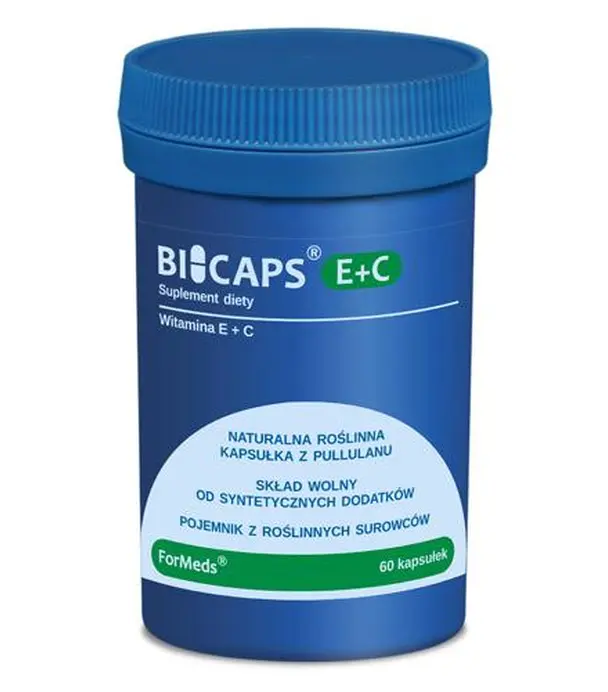 Bicaps witamina E+C zawiera 134 mg naturalnej witaminy E oraz 100 mg witaminy C. Czysty skład – produkt nie zawiera m.in. sztucznych wypełniaczy, przeciwzbrylaczy i barwników. Naturalna, wegańska kapsułka z pullulanu – pozyskiwanego w procesie fermentacji. Pojemnik wytworzony z użyciem roślinnych surowców. Produkt odpowiedni dla wegetarian i wegan.