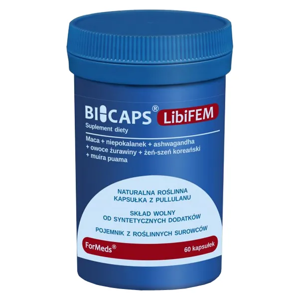 Bicaps LibiFem to produkt przeznaczony dla kobiet. Zawiera m.in. standaryzowane ekstrakty wpływające na funkcje seksualne oraz utrzymanie optymalnego poziomu energii. Czysty skład – produkt nie zawiera m.in. sztucznych wypełniaczy, przeciwzbrylaczy i barwników. Kapsułki wykonane są z naturalnego, wegańskiego pullulanu – pozyskiwanego w procesie fermentacji. Pojemnik wytworzony z użyciem roślinnych surowców. Produkt jest odpowiedni dla wegetarian i wegan.