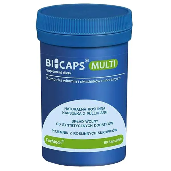 Bicaps multi to kompleks 13 witamin i 7 składników mineralnych. Użyte w produkcie składniki występują w wysoko przyswajalnych formach, m.in. L-selenometionina (selen), P-5-P (B6), L-metylofolian wapnia (B9), metylokobalamina (B12). BICAPS MULTI zawiera również wegańską, mikrokapsułkowaną witaminę D (z porostów) oraz bardzo dobrze przyswajalną witaminę K (mikrokapsułkowany menachinon MK-7 100% trans) pozyskiwaną z olejów roślinnych (geraniol, farnesol). Czysty skład – produkt nie zawiera m.in. sztucznych wypełniaczy, przeciwzbrylaczy i barwników. Naturalna, wegańska kapsułka z pullulanu – pozyskiwanego w procesie fermentacji. Pojemnik wytworzony z użyciem roślinnych surowców. Produkt odpowiedni dla wegetarian i wegan.
