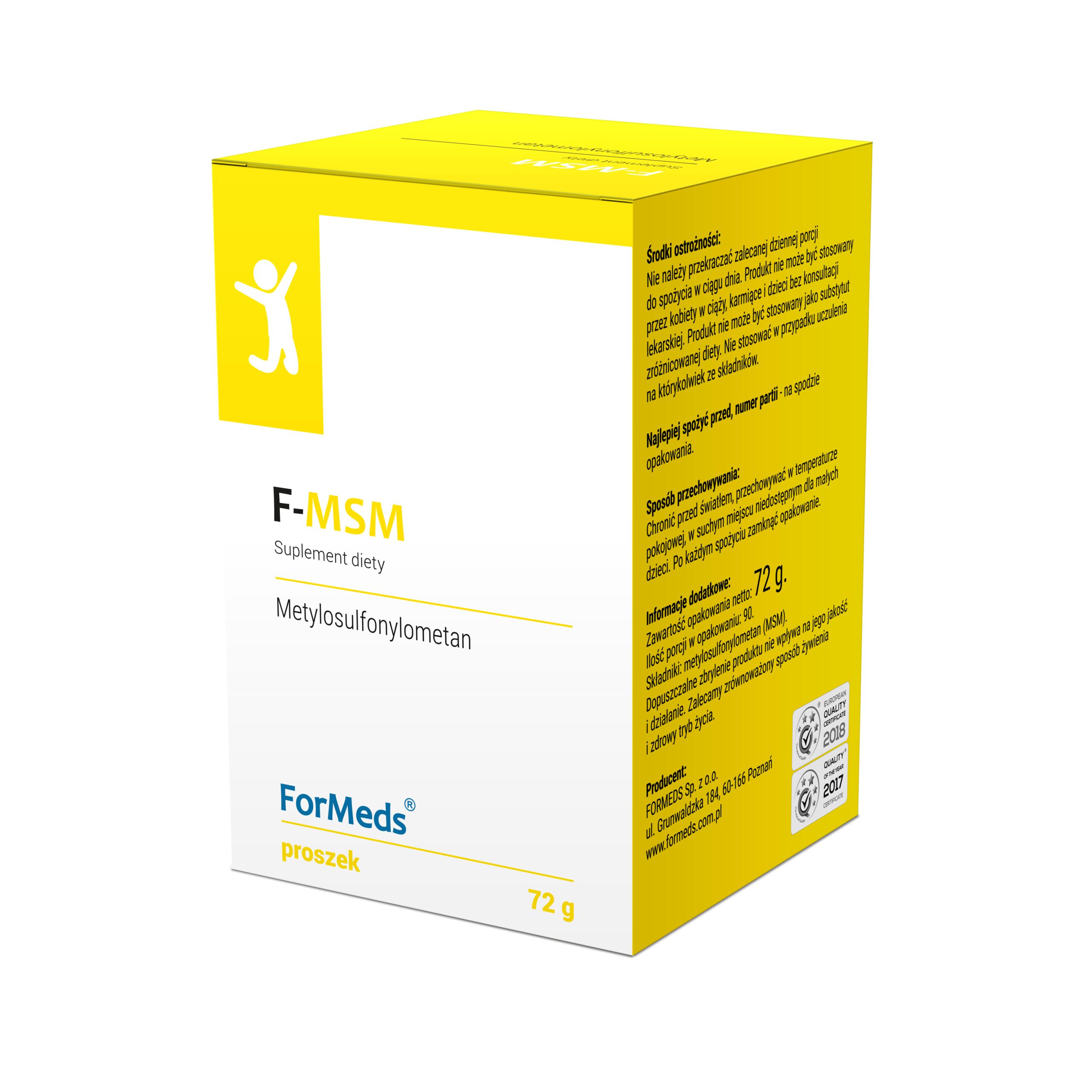 F-MSM zawiera 800 mg siarki organicznej w formie proszku. Czysty skład – produkt nie zawiera m.in. sztucznych wypełniaczy, barwników i konserwantów. F-MSM jest odpowiedni dla wegetarian i wegan.