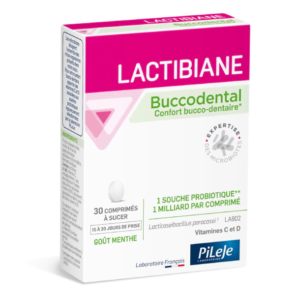 Lactibiane Buccodental to probiotyk, który zalecany jest w przypadku nawracających stanów zapalnych jamy ustnej oraz u osób ze skłonnościami do powstawania próchnicy. Zawarte w nim szczepy bakterii kwasu mlekowego, takie jak Lactobacillus paracasei, korzystnie wpłyną również na nasz układ pokarmowy, skutecznie walcząc z bakteriami: Helicobacter pylori czy Salmonella enterica oraz redukując negatywne działanie Candida Albicans.