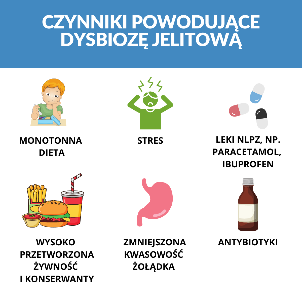 Poniższe problemy zdrowotne mogą być wynikiem nieprawidłowej mikrobioty jelitowej: